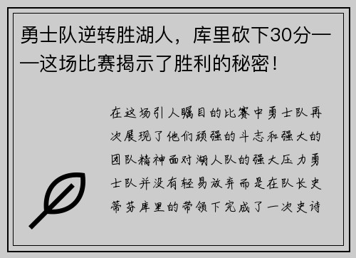 勇士队逆转胜湖人,库里砍下30分——这场比赛揭示了胜利的秘密!