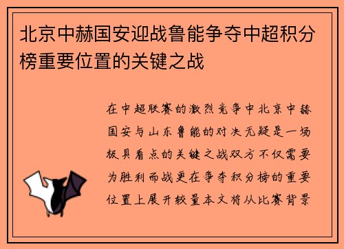 在中超联赛的激烈竞争中,北京中赫国安与山东鲁能的对决无疑是一场极具看点的关键之战。双方不仅需要为胜利而战,更在争夺积分榜的重要位置上展开较量。本文将从比赛背景、球队状态、战术分析及球迷影响四个方面深入探讨这场精彩对决,力求全面呈现出这场赛事的重要性和看点。在充满悬念和激情的比赛中,谁能在这场关键之战中笑到最后,将直接影响整个赛季的走势,也将成为球迷们津津乐道的话题。